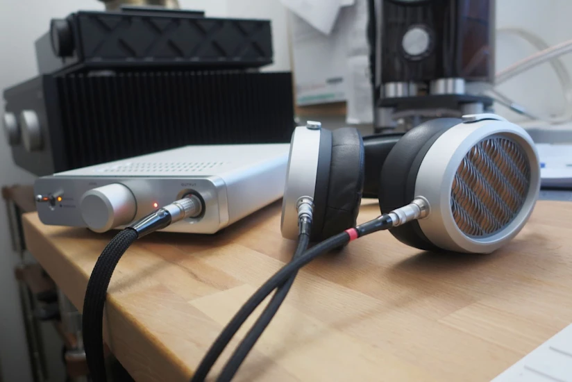 耳机通过 Straight Wire 线材连接耳放,旨在实现最低电容——每米仅 50 mF。导体为镀银无氧铜,外覆聚乙烯泡棉。线材耐用性通过凯夫拉纤维缠绕增强,同时左右声道接地在物理上独立,耳放端仍为单一接口。